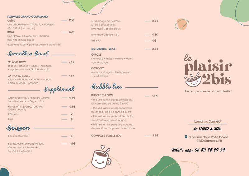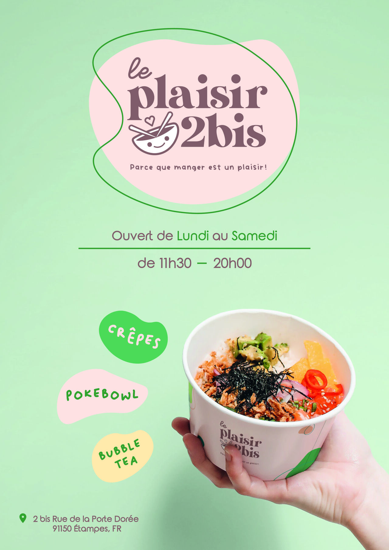 Vous pouvez vous faire plaisir avec soit une salade Poké bowl ou pour les plus gourmands de savoureuses crêpes salées ou sucrées, le tout accompagné de jus naturels 100 % fruits pressés sur place. « Le Poké bowl est composé d’une base de riz et d’une protéine (bœuf ou saumon), de 5 ingrédients parmi des légumes et des fruits et d’un topping : oignons croustillants ou graines de sésame le tout assaisonné d’une sauce balsamique ou à l’huile de sésame. Nous proposons de faire découvrir aux Étampois des produits typiques de la cuisine malgache : le bonbon anglais, une limonade importée de Madagascar et un plat de feuilles de manioc à agrémenter de viande de porc, ou de poisson à la maison.